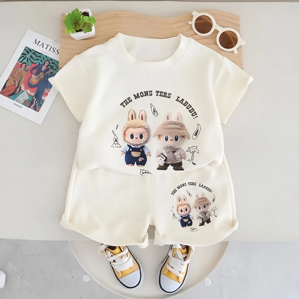 เสื้อแขนสั้นกางเกงขาสั้น พิมพ์ลายลาบูบู้ สีขาว